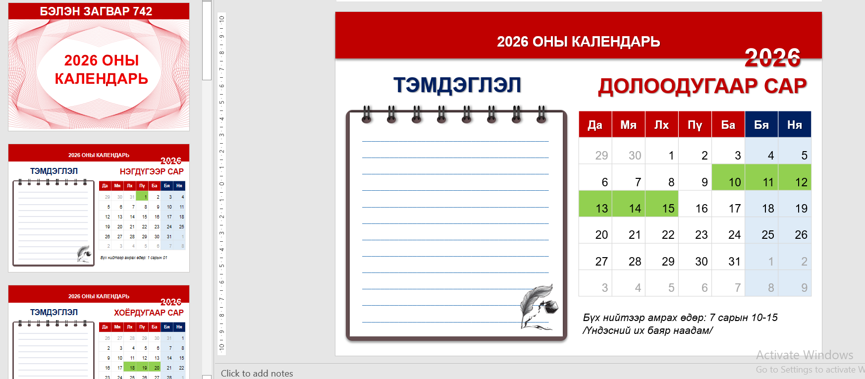 2026 Календарь загвар. Өнгө, өгөгдлийг өөрчлөх боломжтой Powerpoint файл.