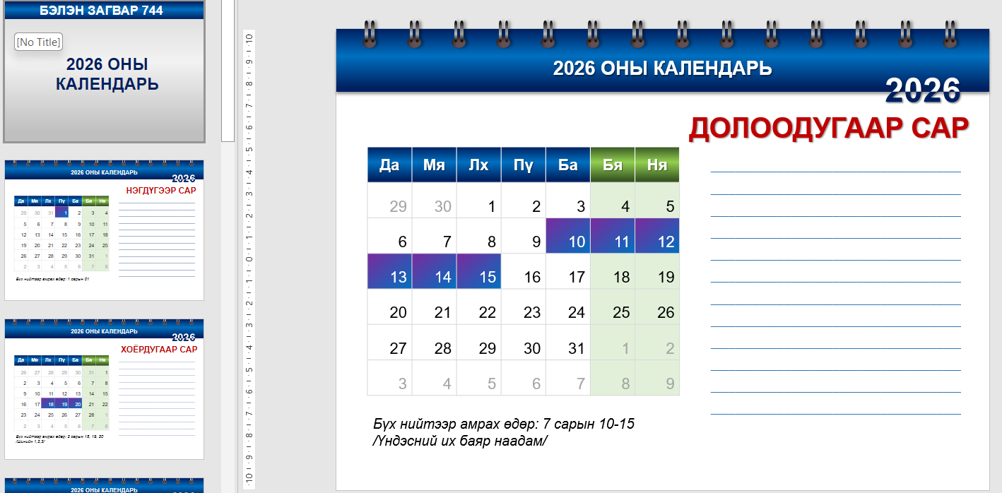 2026 Календарь загвар. Өнгө, өгөгдлийг өөрчлөх боломжтой Powerpoint файл.
