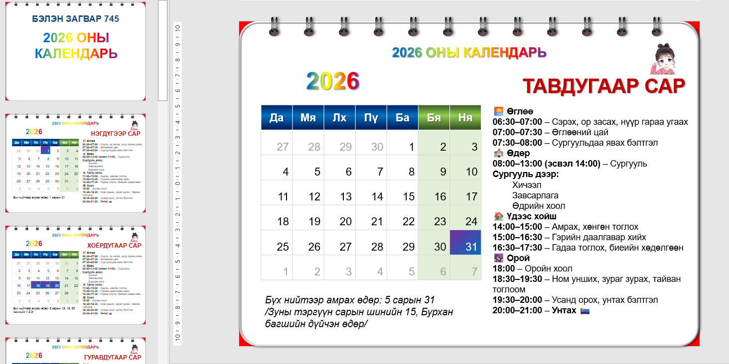 2026 Календарь загвар. Өнгө, өгөгдлийг өөрчлөх боломжтой Powerpoint файл.